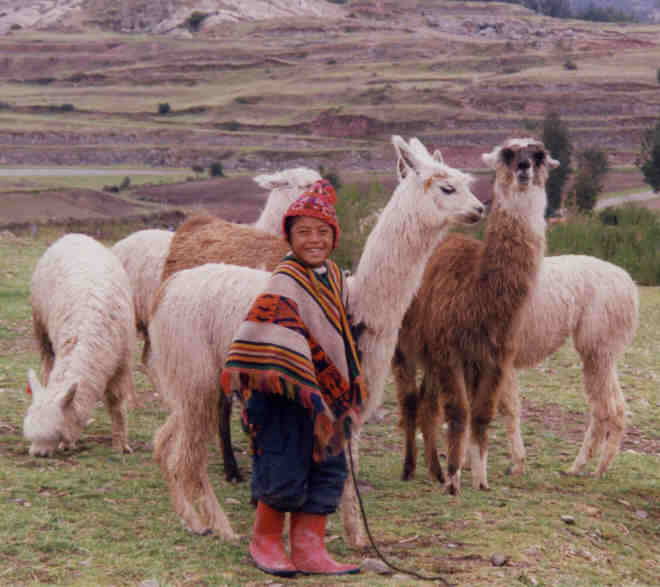 When I saw this herd coming down the road, I thought my old thought: "God would never have invented goats (and llamas) if they weren't for small boys to herd". A moment later, the reason for the herd's movement became visble behind them. I almost got a candid shot (note attire from waist down), but an adult threw the kid the hat and cape to "improve" the picture.